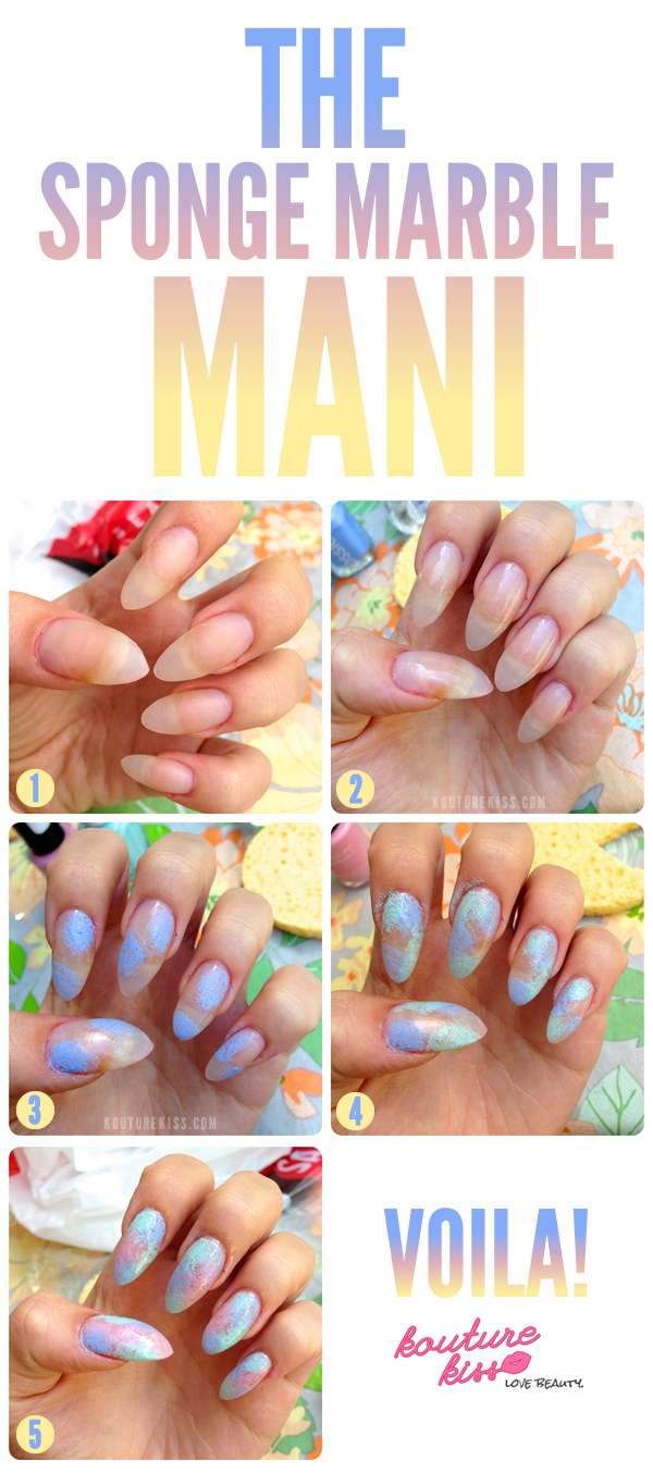 Today I am coming to you with a nail tutorial! I am usually awful at doing fancy designs on my nails, but they look so easy in the photos! This tutorial however is so simple that you could do it blind folded. This is inspired by water colors, so I kept with the pastel theme. The tools you will need are: any type of makeup sponge, a top and base coat, and however many pastel colored nail polishes you would like to use.